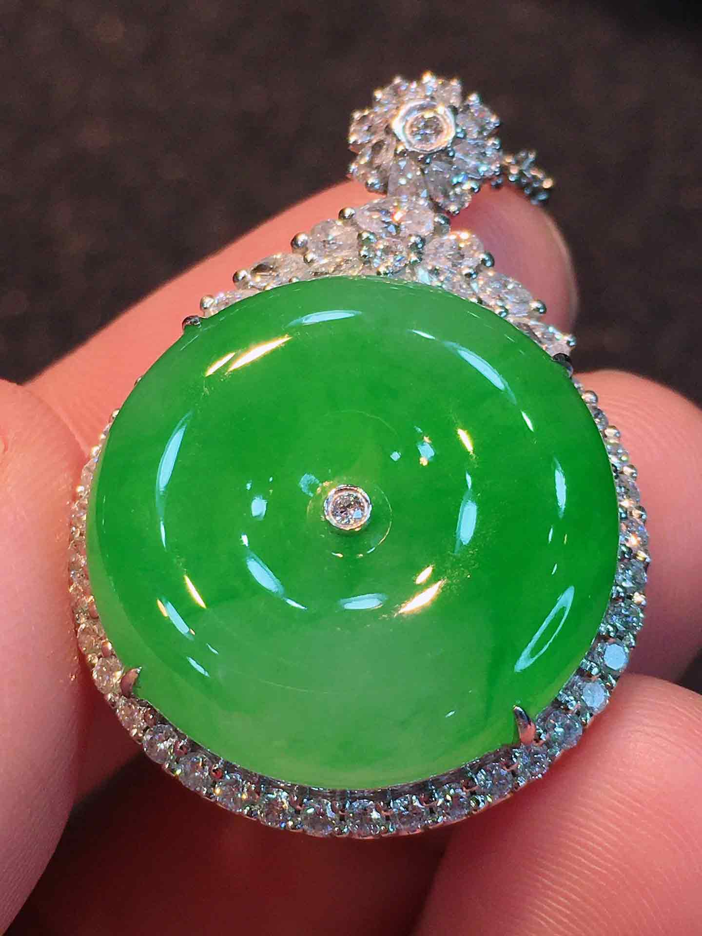 🍀满色平安扣吊坠,平平安安 厚桩饱满,翠色阳艳,种老起胶,水色相融。18K金伴钻豪华镶嵌